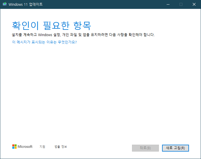 윈도우 11 업데이트 중 확인이 필요한 항목 창 윈도우 11 업데이트 중 자꾸 이런 창이 뜨면서 업데이트 진행이 되지 않습니다ㅠㅠ. 윈도우10 설치 중 확인이 필요한 항목 내공 100. 위 화면처럼 확인이 필요한 항목도 나오지 않음.